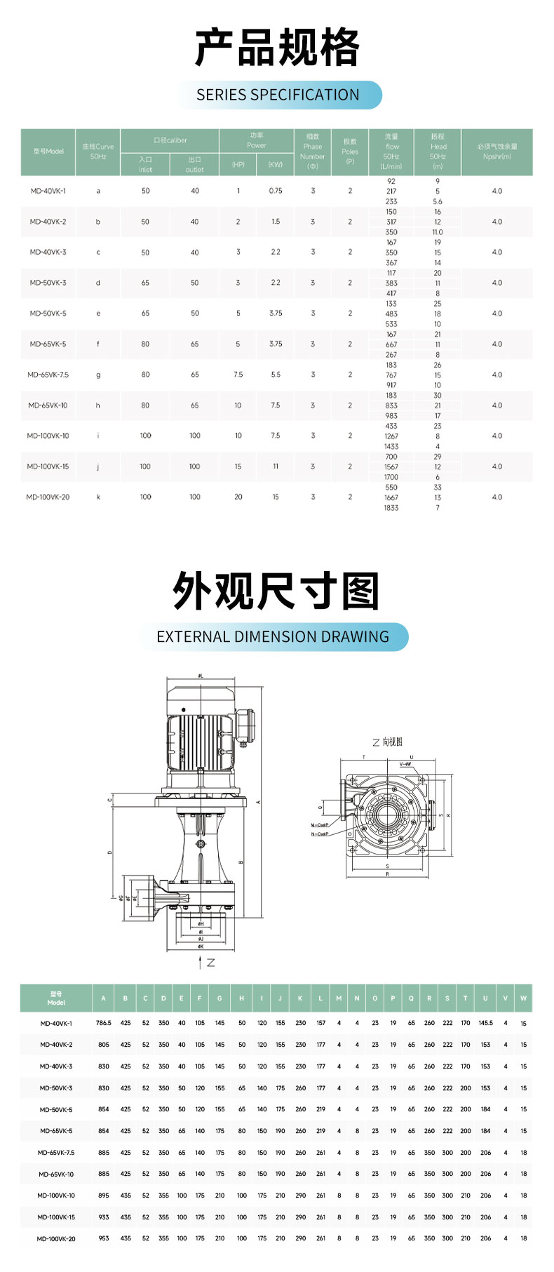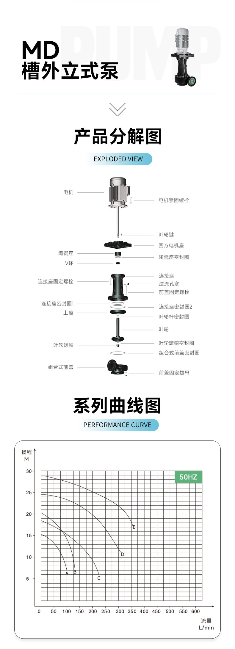 美寶耐酸堿槽外立式泵廠家,多種口徑、功率齊全,非標定制。美寶槽外立式泵MD系列,揚程可達到29米,流量1730L/min。