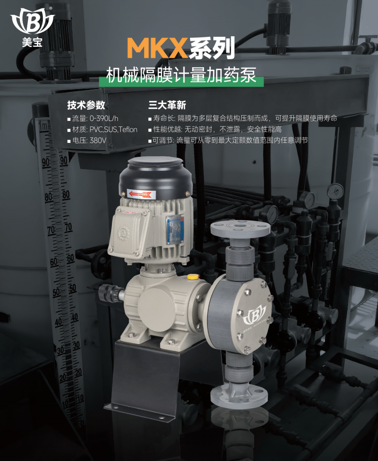 美寶MKX系列機(jī)械隔膜計量泵: 采用原塑料,一體注塑成型,美寶加藥泵 注于耐酸堿藥水的輸送; 細(xì)節(jié)決定成敗,美寶加藥泵采用齒輪減速,增長使用壽命,節(jié)約維修成本; 采用立式電機(jī),節(jié)省安裝空間,且外觀美觀。